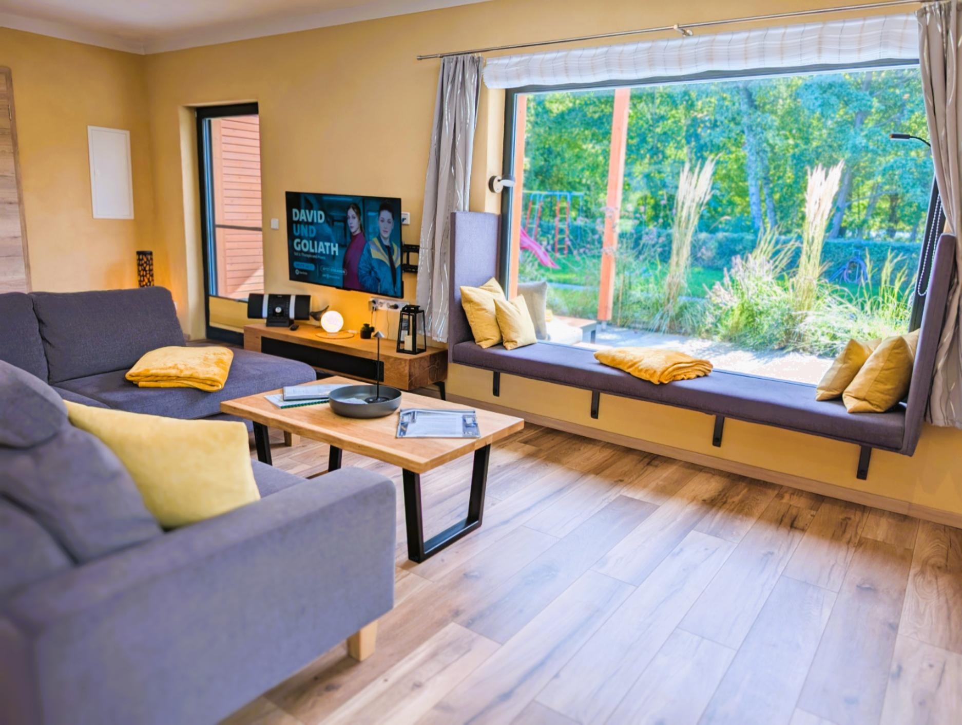 Im großen Wohnzimmer befindet sich über der Sofalandschaft ein außergewöhnlicher virtueller nachtleuchtender Sternenhimmel an der Zimmerdecke. Es erwarten Sie die Sternbilder des kompletten Kalenderjahres, mit Milchstraße und mehr.